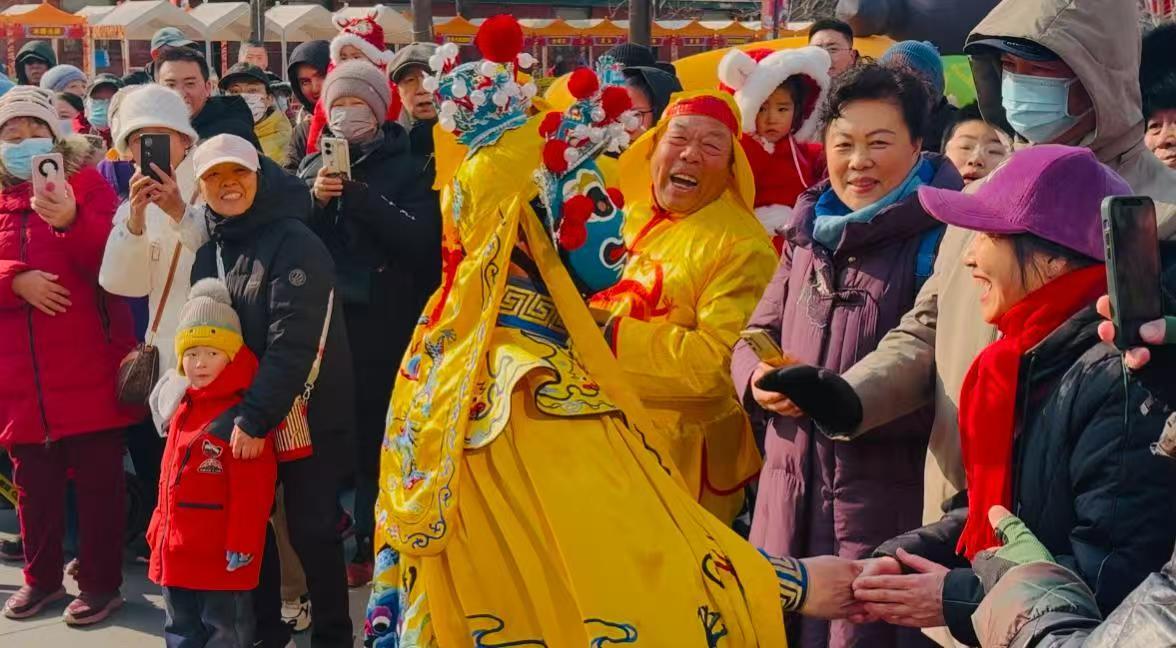 在年俗演出現(xiàn)場,只見“變臉大師”頭戴花冠穿錦衣,轉(zhuǎn)身揮袖間,多臉齊變令人直呼過癮;獅舞慶新年,金鼓聲聲喧。舞獅作為一種中國民間傳統(tǒng)的表演藝術(shù),寓意事事如意。只見表演者裝扮成獅子模樣,在鑼鼓音樂的伴奏下,身輕如燕做出獅子的各種形態(tài)動作,以龍騰虎躍神獸舞為春節(jié)助慶;一曲《紅梅贊》搭配京劇的曲調(diào),字正腔圓地以紅梅傲雪的精神,將“一片丹心向陽開”的熱情傳達(dá)給每一位觀眾;河北梆子《大登殿·金牌調(diào)來銀牌宣》的表演者嗓音明亮,氣勢十足,唱得又穩(wěn)又好,贏得了觀眾們的陣陣掌聲和聲聲喝彩。另有滑稽劇演繹百態(tài)人生,《烏蘇里船歌》《草原夜色美》《呼倫貝爾大草原》旋律優(yōu)美的獨(dú)唱,豫劇《朝陽溝·祖國的大建設(shè)一日千里》《花木蘭·誰說女子不如男》、京劇《紅燈記·光輝照兒永向前》、評劇《花為媒·李月娥遮衫袖》等耳熟能詳?shù)慕?jīng)典傳統(tǒng)戲曲段子依次上演,在熱鬧與喧囂的喜慶氛圍中,傳達(dá)著新年的祝福與吉祥。